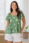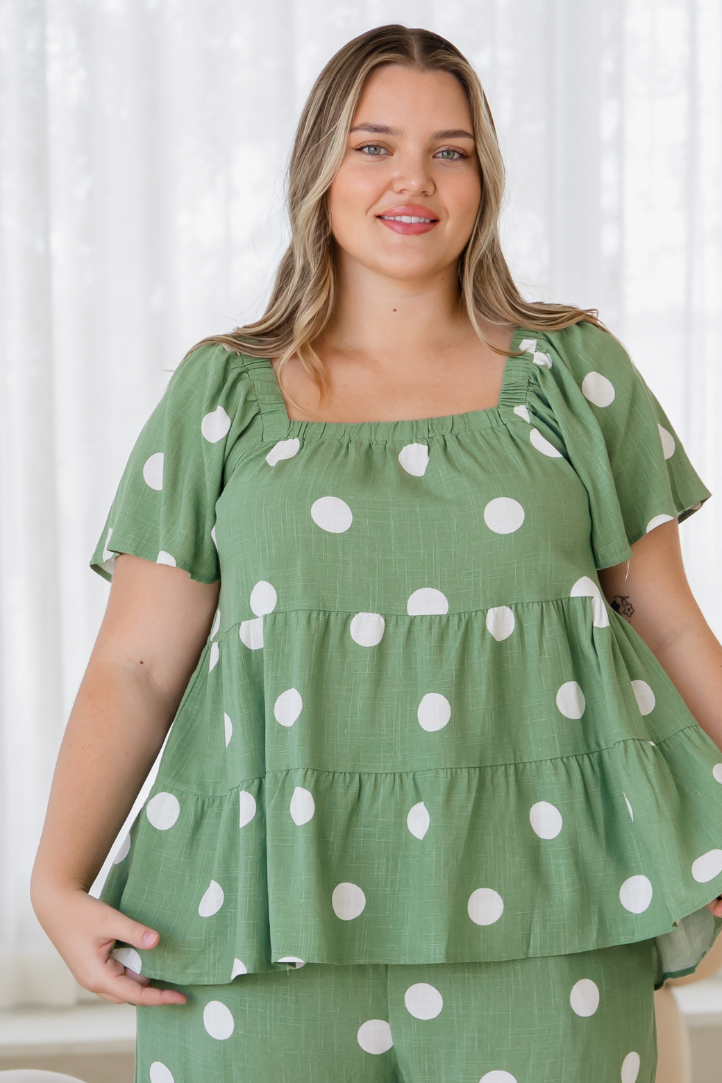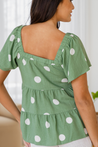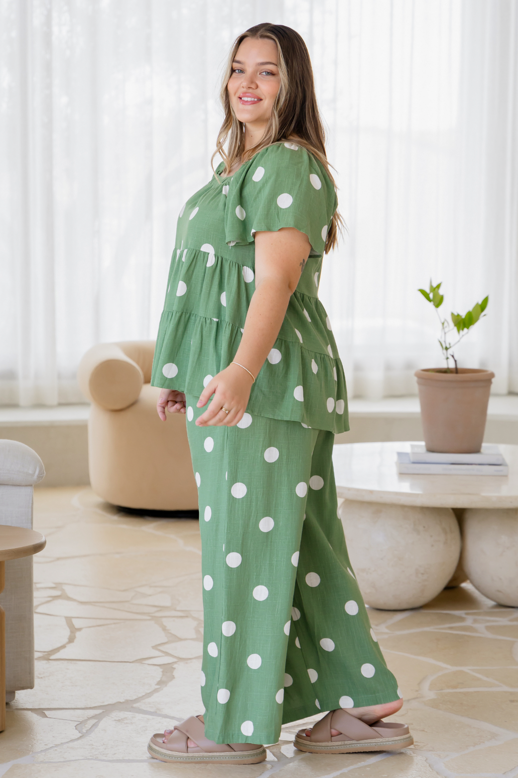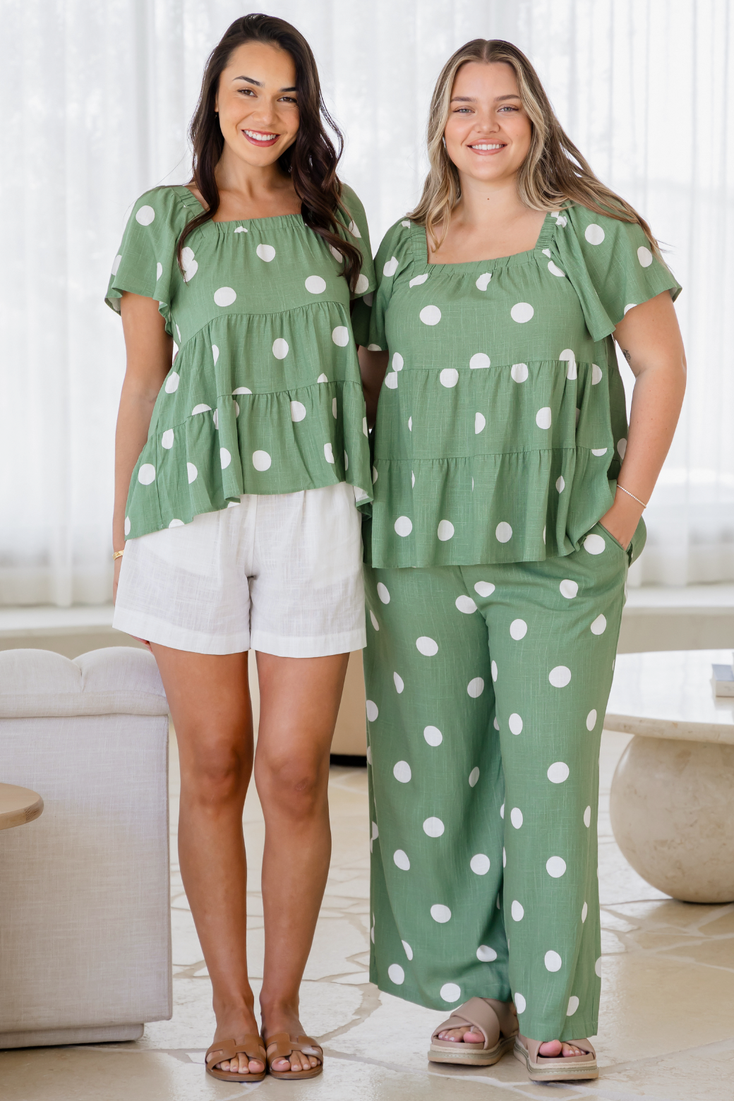 The Alexandria Top in Sage Spot pairs relaxed elegance with eye catching charm. This lightweight blouse features a soft sage base embraced by crisp white polka dots, the perfect balance of subtle and statement!