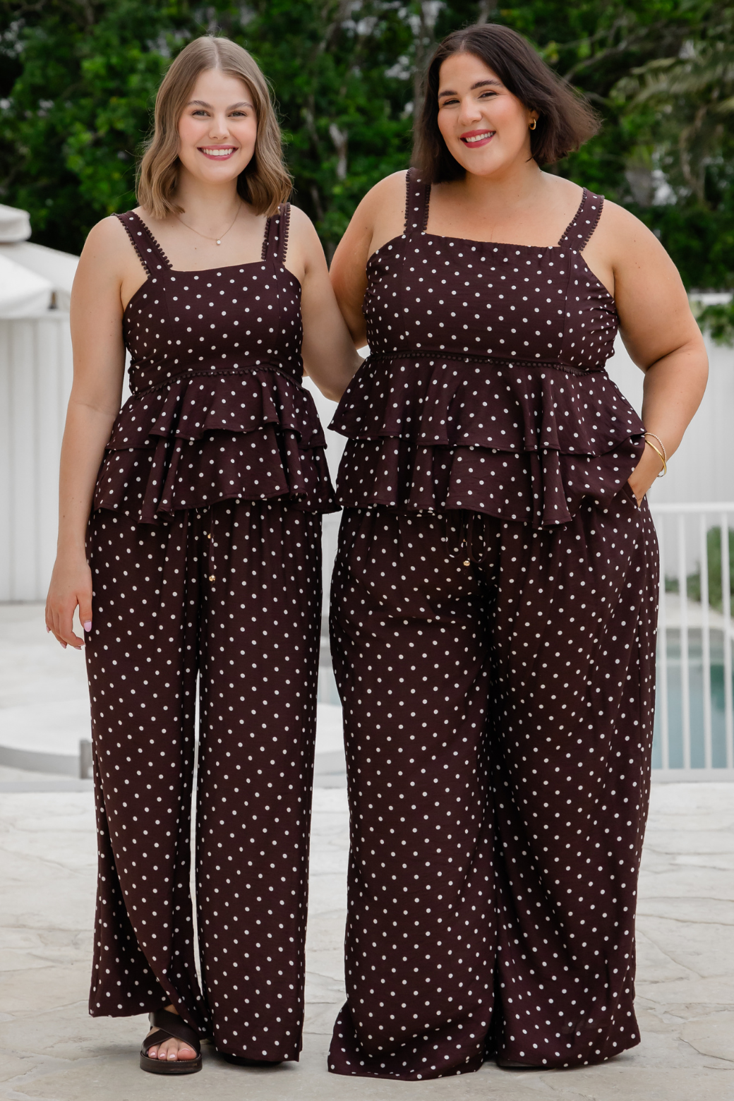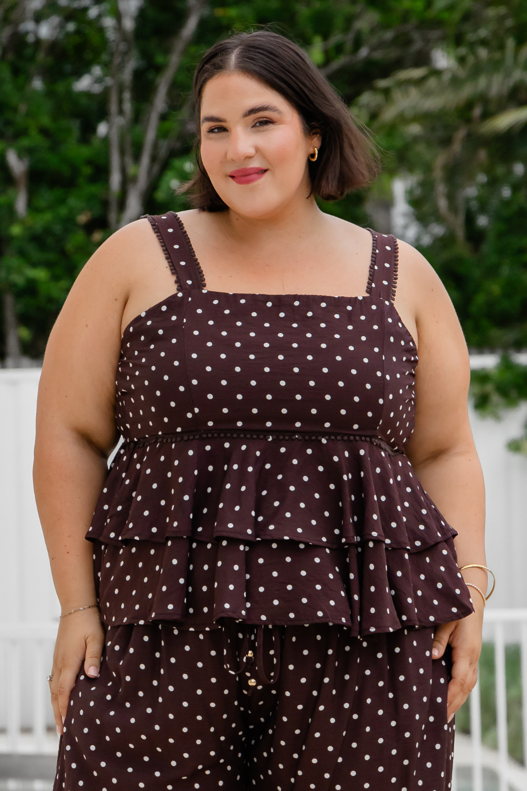 Effortlessly stylish, the Caris Top features a soft silhouette with a delicate mini spot print on a rich bitter chocolate base, perfect for refined everyday wear!