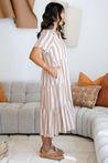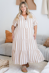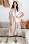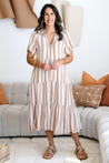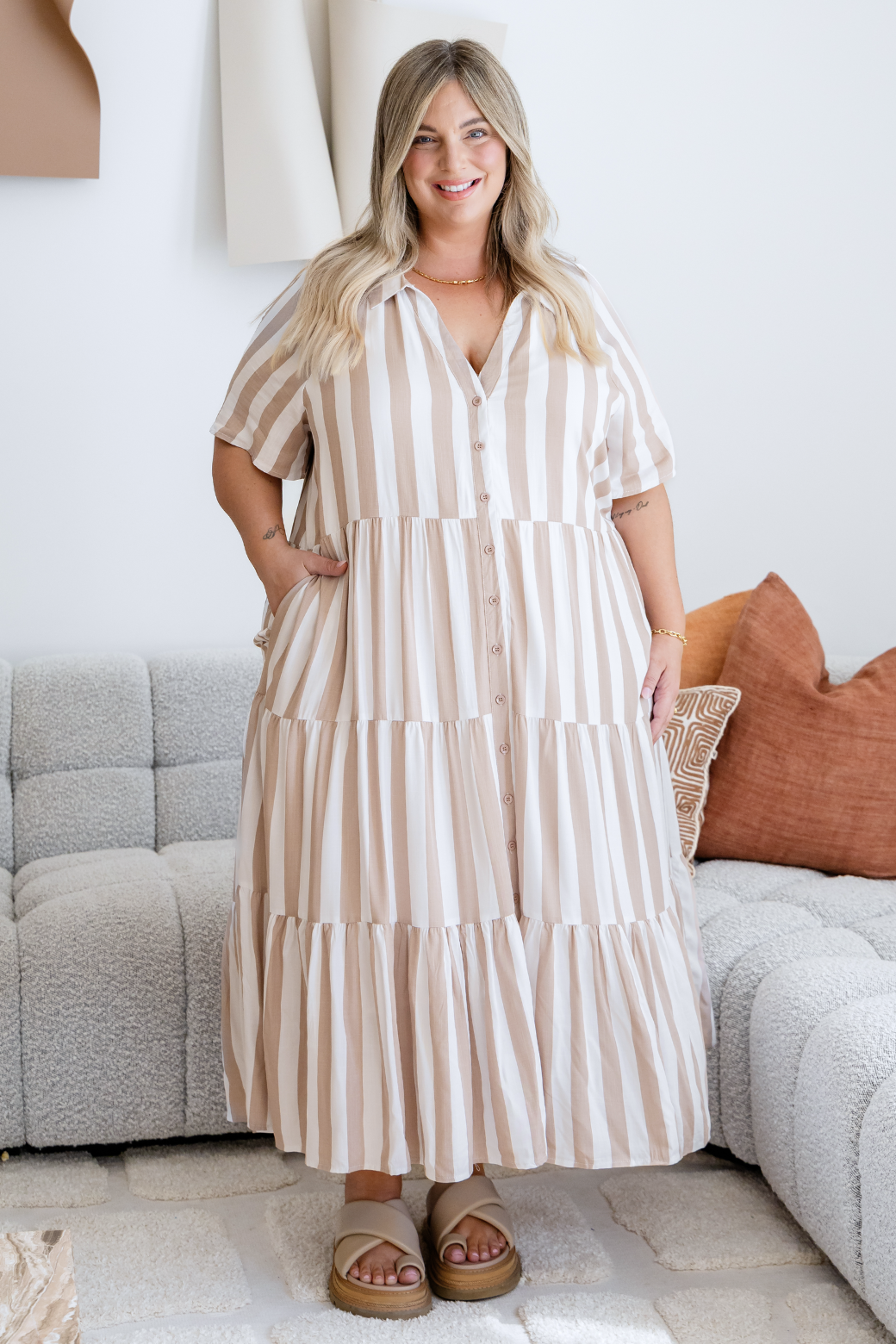 Say hello to the Maeve Midi Dress in Latte Stripe, light, floaty, and made to move with you. With its breezy vibes and effortless drape, it’s your best friend for sunny spring days!
