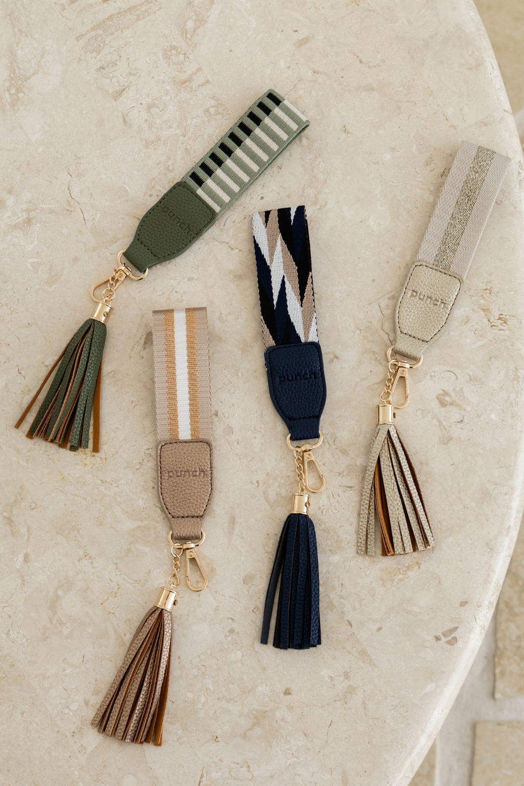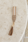 Add a pop of colour and function with the Punch Strap Keyring – the perfect hands-free accessory for everyday convenience. Designed with soft, multi-tone webbing and finished with our signature geometric motif, this keyring features a vegan leather tab, light gold hardware, and an easy-to-clip strap. Attach it to your Punch wallet, pouch, or keys to keep essentials close and easy to find. A stylish and practical addition to your handbag, available in our new season colourway, bronze.